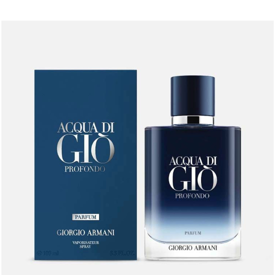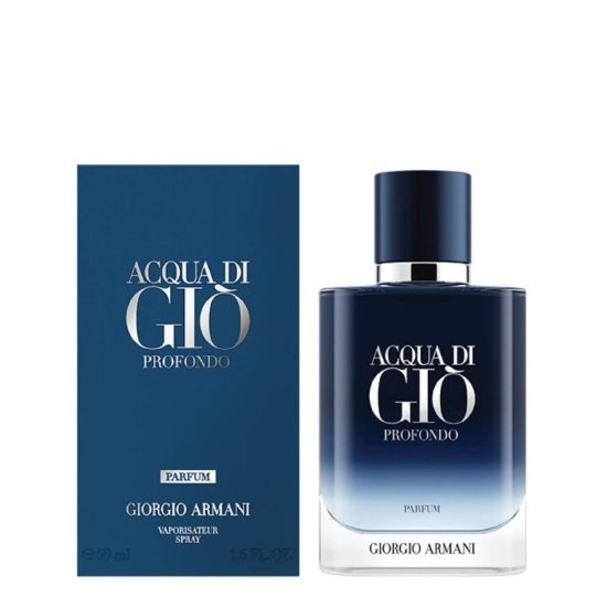 Giorgio Armani Acqua di Giò Profondo Parfum moderni, aromatični miris koji obuhvata vrednosti kao što su slobodan duh i moderna muškost. Snažan, sofisticiran i savremeni miris s izraženom notom muževnosti. Profinjena plava nijansa bočice odaje počast kultnoj boji Giorgia Armanija. Dugotrajniji i intenzivniji nego ikada, Acqua di Giò Profondo Parfum predstavlja vrhunac intenziteta u kolekciji. Vrhunske note uključuju kultne morske arome, osvežavajuće citrusne tonove i začinske naglaske. U srednjoj noti dominiraju aromatični akordi, dok u zavodljivoj baznoj noti preovladava senzualni ton ćilibara. Od upotrebe pažljivo odabranih prirodnih sastojaka do bezvremenskog dizajna, Acqua di Giò Profondo Parfum odiše jednostavnošću, posebnošću i održivošću.