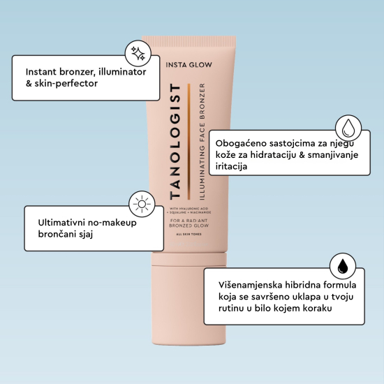 Instant preplanulost za lice uz dodatak nege kože. Insta Glow Face pruža trenutan, osvetljen bronzani ten uz hidrataciju i ujednačen ten – za savršen izgled u svega nekoliko sekundi.